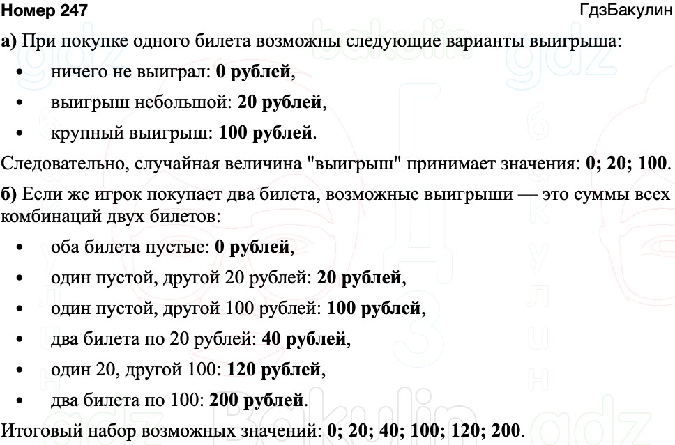 В моментальной лотерее участвуют три типа билетов: без выигрыша (выигрыш 0 рублей), с выигрышем 20 рублей и с выигрышем 100 рублей. Можно ли считать выигрыш играющего случайной величиной? Какие значения может принимать эта величина, если играющий покупает: