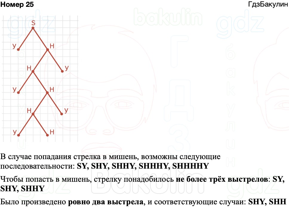 У стрелка в тире 5 пуль для пневматического ружья. Если стрелок попал в мишень, то больше он не стреляет, а если промахнулся, то продолжает стрелять, пока остаются пули. Постройте дерево этого случайного опыта. Отметьте в этом дереве событие: a) «стрелок попал в мишень»; б) «для поражения мишени понадобилось не более трёх пуль»; в) «всего было сделано 2 выстрела».