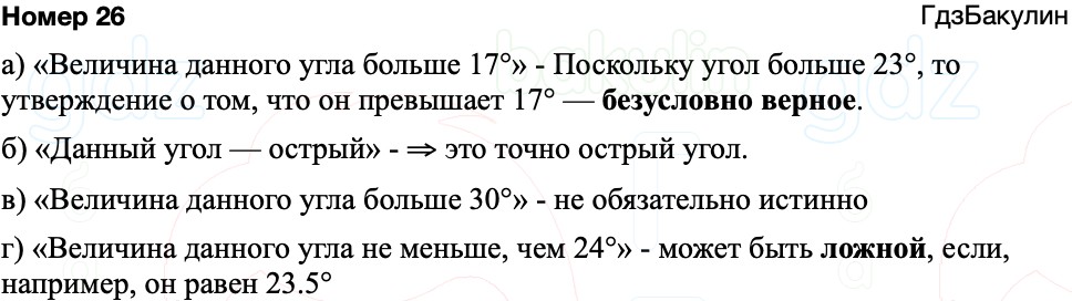 Дан угол. Известно, что истинно утверждение «величина данного угла больше 23° и величина данного угла меньше, чем 45°». Какие из следующих высказываний истинны, а какие - могут оказаться ложными?