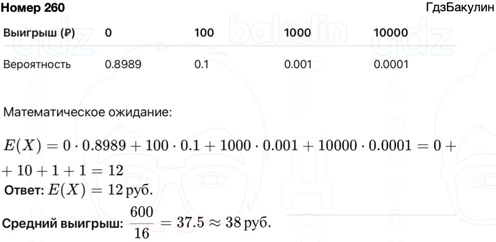 Организатор лотереи напечатал всего 10 000 лотерейных билетов. Цена каждого билета 50 р. Известно, что 1000 билетов дают выигрыш 100 р., ещё в 10 билетах - выигрыш 1000 р., а на 1 билет приходится главный выигрыш 10 000 р. Все прочие билеты без выигрыша. Найдите математическое ожидание случайной величины «выигрыш на один случайный лотерейный билет». Сравните средний выигрыш с ценой билета.