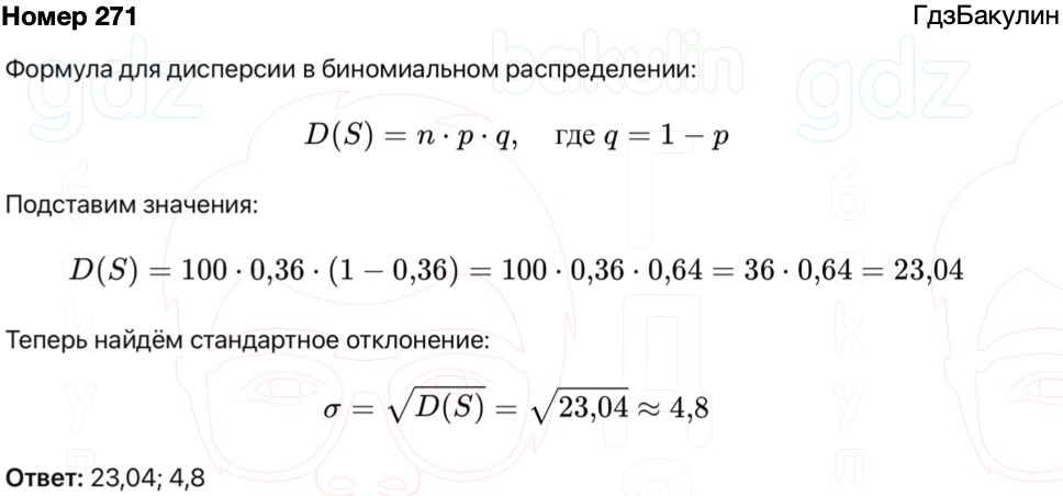 По полу рассыпали содержимое коробки, в которой было 100 канцелярских кнопок. Кнопка падает остриём вверх с вероятностью 0,36. Найдите дисперсию и стандартное отклонение величины «число кнопок, упавших остриём вверх».