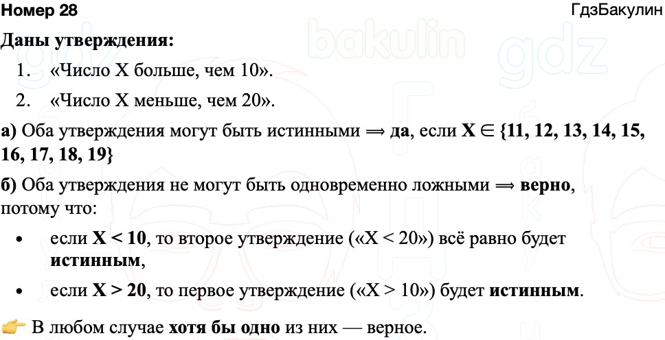 Даны два утверждения: «Число Х больше, чем 10» и «Число Х меньше, чем 20». Могут ли оба утверждения оказаться: