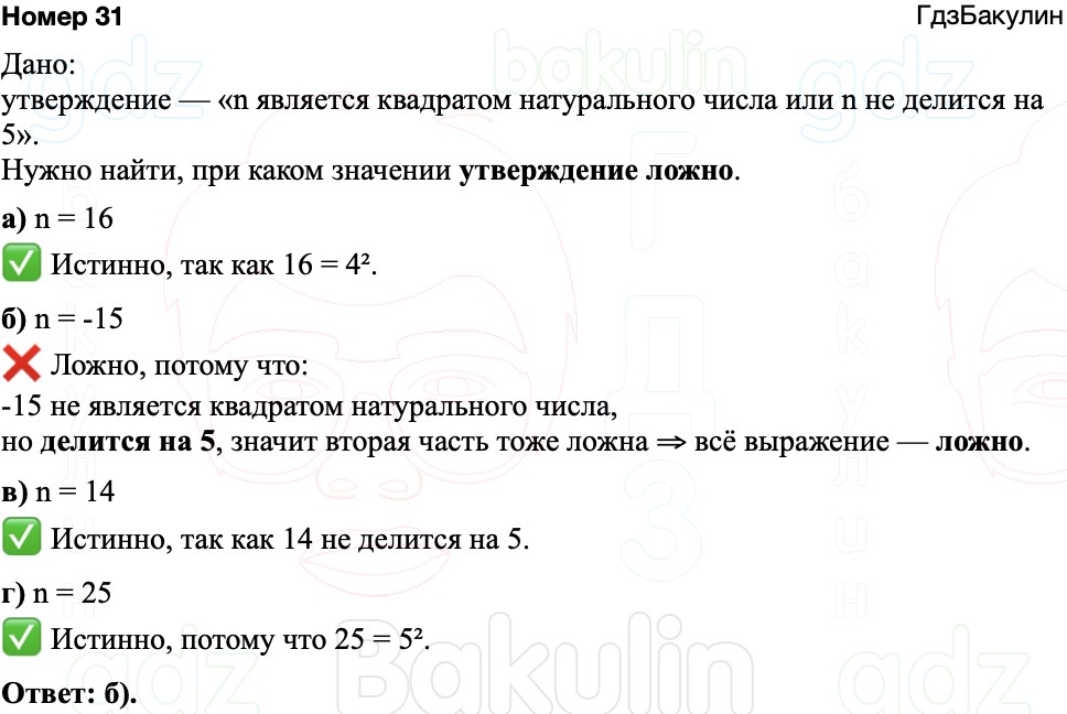 Известно, что число п натуральное. Дано утверждение «Число п является квадратом некоторого натурального числа или число п не делится на 5». Для каких из предложенных значений п это утверждение ложно?