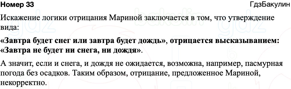 Марина строила отрицание к утверждению «Завтра будет снег или завтра O V - дет дождь». У неё получилось «Завтра будет солнечно». Верно ли построено отрицание! Объясните свой ответ.