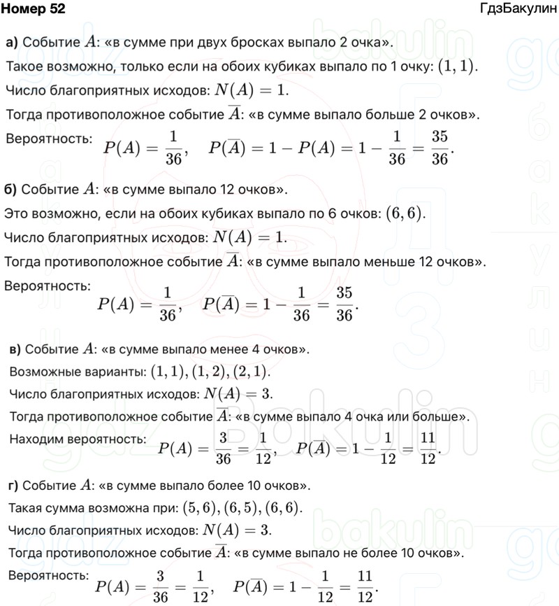 Игральную кость бросают дважды. Опишите словами событие, противоположное событию А, и найдите его вероятность, если событие А состоит в том, что в сумме при двух бросках выпадет: а) 2 очка; б) 12 очков; в) менее 4 очков; г) более 10 очков.