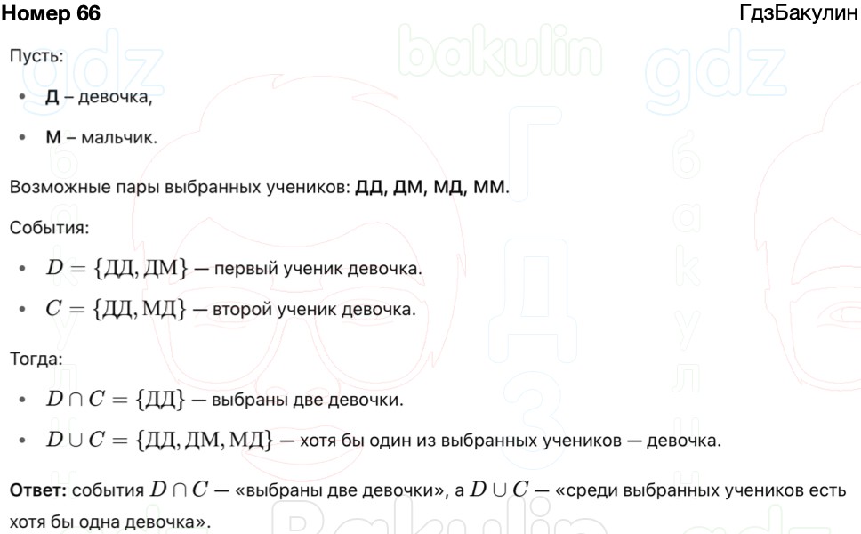 Из класса случайным образом последовательно выбирают двух учеников. Событие D - «первый выбранный ученик - девочка». Событие С - «второй выбранный ученик - девочка». Опишите словами события D Ç C и D È C.