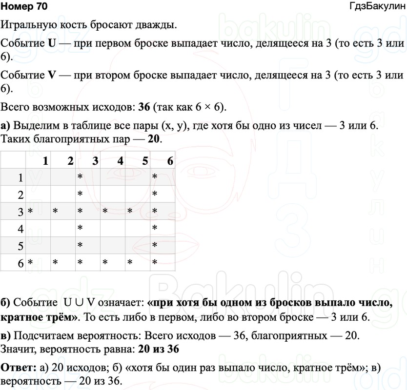 Игральную кость бросают дважды. Событие U - «в первый раз выпадет число очков, кратное трём». Событие V - «во второй раз выпадет число очков, кратное трём».