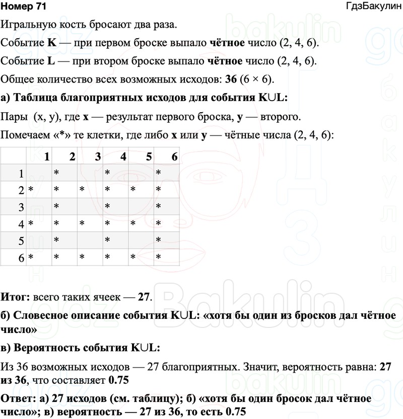a) Выделите в таблице элементарные события, которые благоприятствуют хотя бы одному из событий К и L. Сколько их?