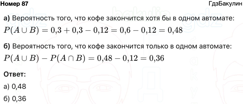 В торговом центре недалеко друг от друга расположены два автомата, продающие кофе. Вероятность того, что к вечеру в первом автомате закончится кофе, равна 0,3. Такая же вероятность того, что кофе закончится во втором автомате. Вероятность того, что кофе закончится в двух автоматах, равна 0,12. Найдите вероятность события: