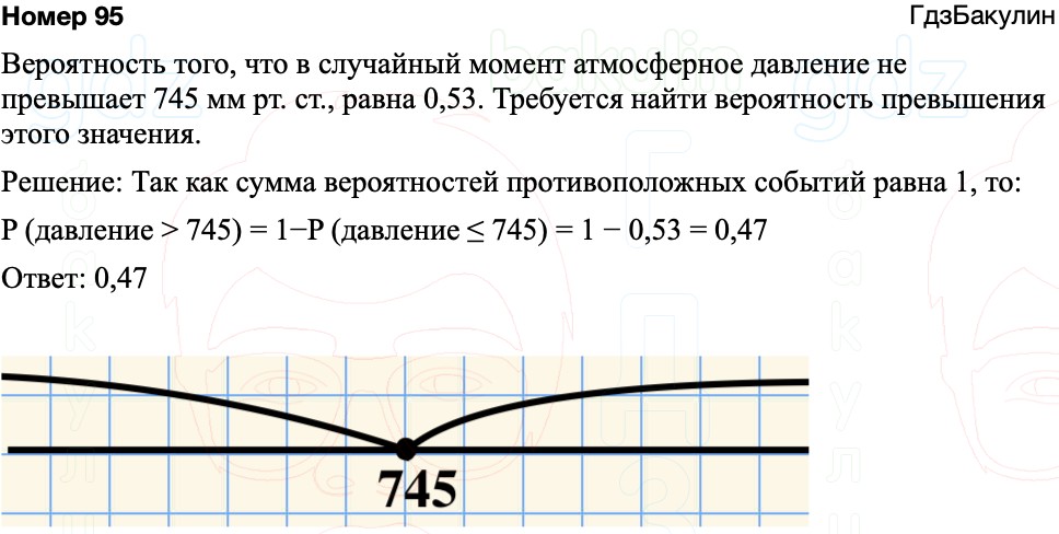 Вероятность того, что в случайный момент времени атмосферное давление в некотором городе не выше 745 мм рт. ст., равна 0,53. Найдите вероятность того, что в случайный момент давление превышает 745 мм рт. ст. Изобразите соответствующие события на числовой прямой.