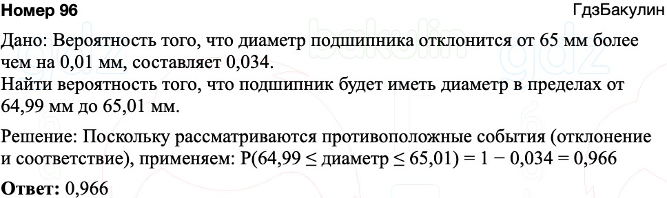При изготовлении подшипников диаметром 65 мм вероятность того, что диаметр будет отличаться от заданного более чем на 0,01 мм, равна 0,034. Найдите вероятность того, что случайный подшипник будет иметь диаметр в пределах от 64,99 до 65,01 мм.