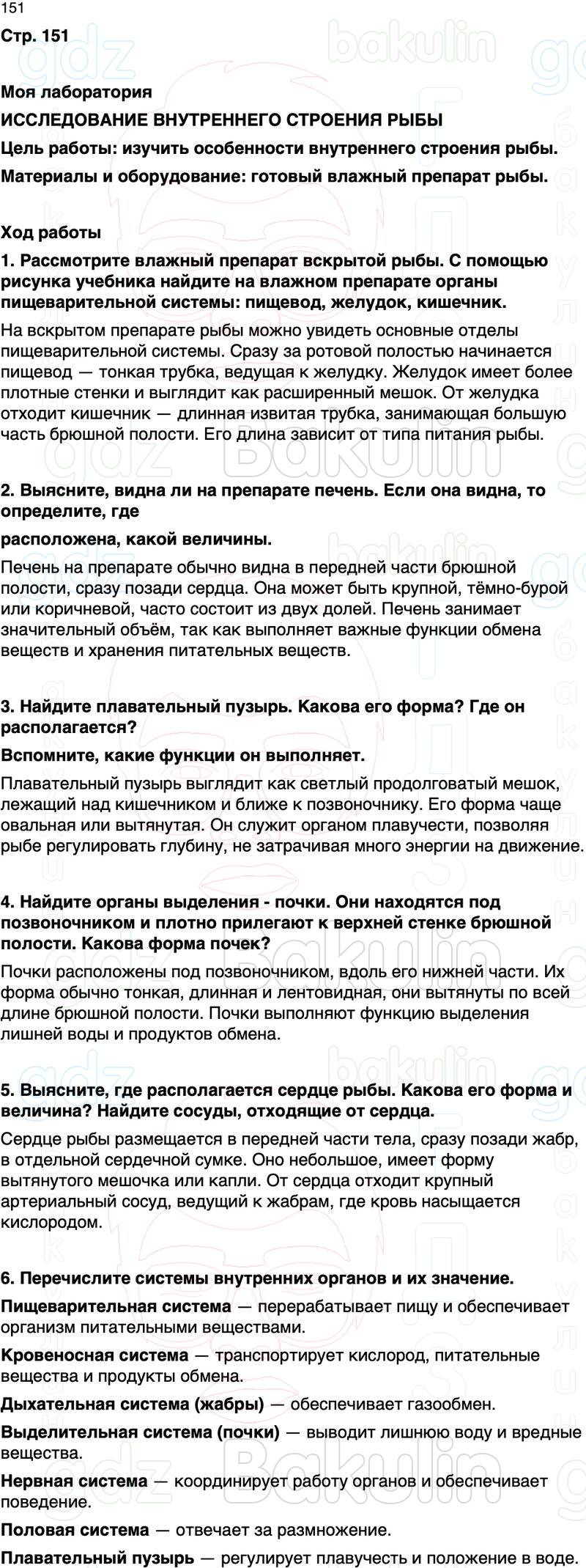1. Рассмотрите влажный препарат вскрытой рыбы. С помощью рисунка учебника найдите на влажном препарате органы пищеварительной системы: пищевод, желудок, кишечник.