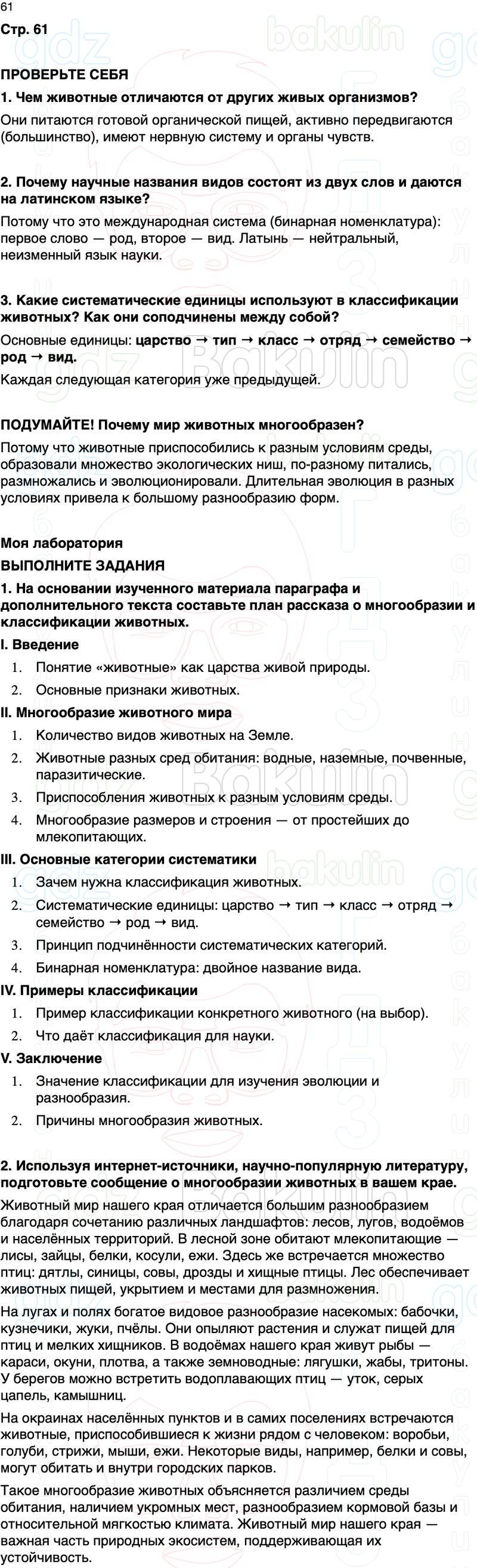 1. На основании изученного материала параграфа и дополнительного текста составьте план рассказа о многообразии и классификации животных.