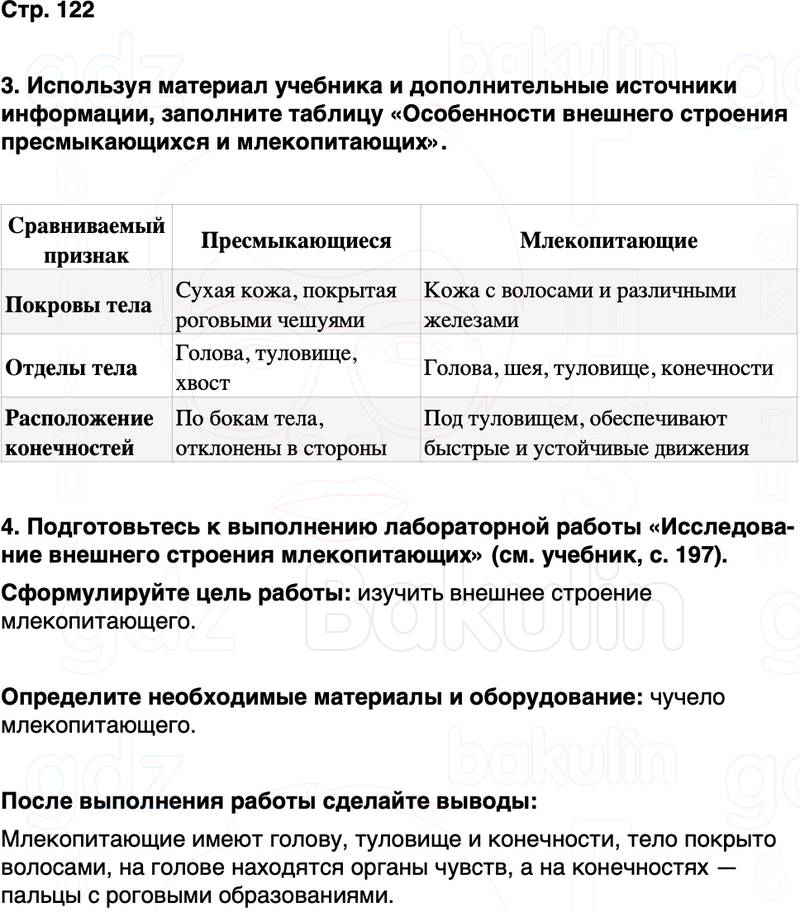 3. Используя материал учебника и дополнительные источники информации, заполните таблицу «Особенности внешнего строения пресмыкающихся и млекопитающих».