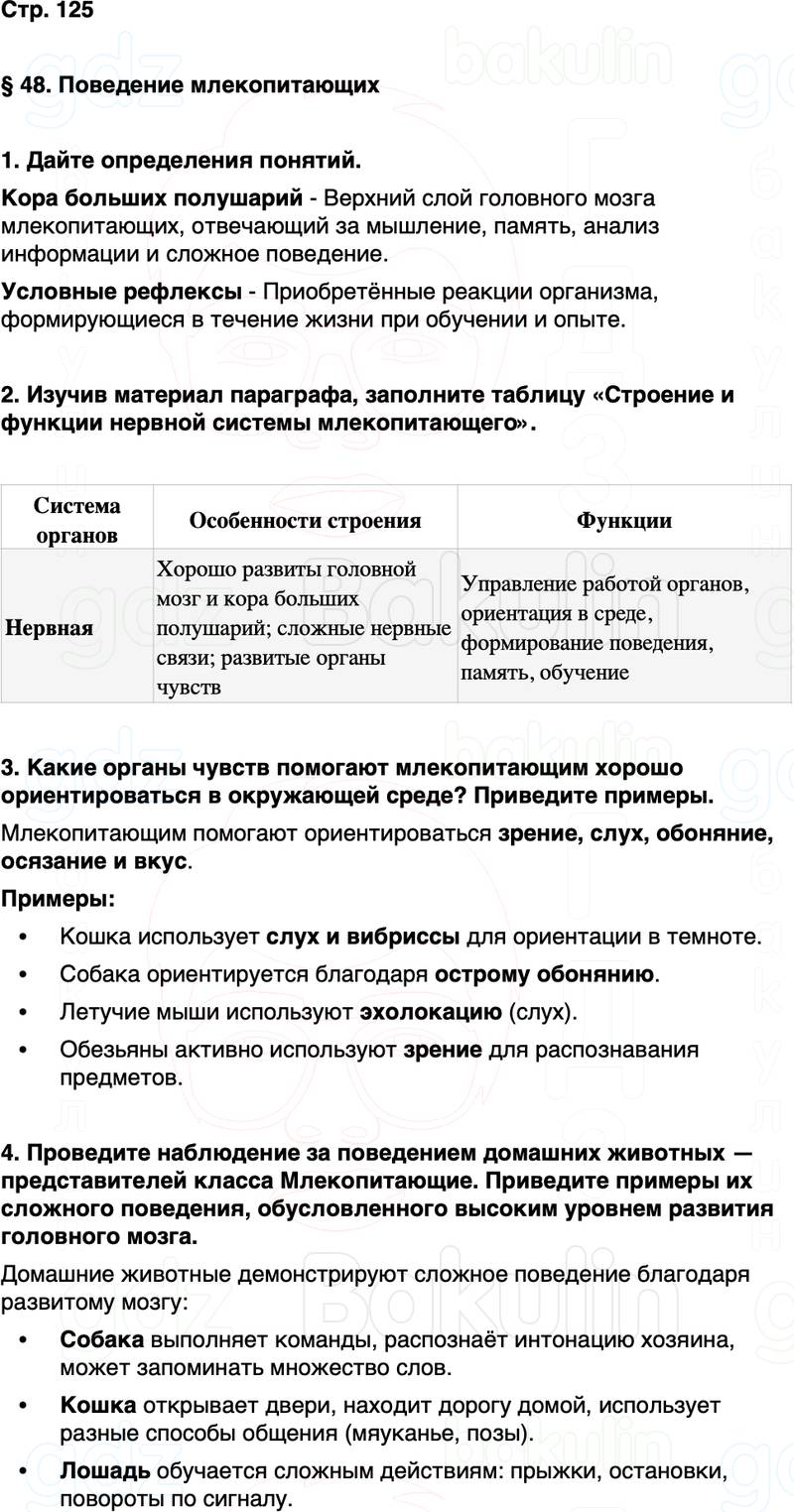 4. Проведите наблюдение за поведением домашних животных — представителей класса Млекопитающие. Приведите примеры их сложного поведения, обусловленного высоким уровнем развития головного мозга.
