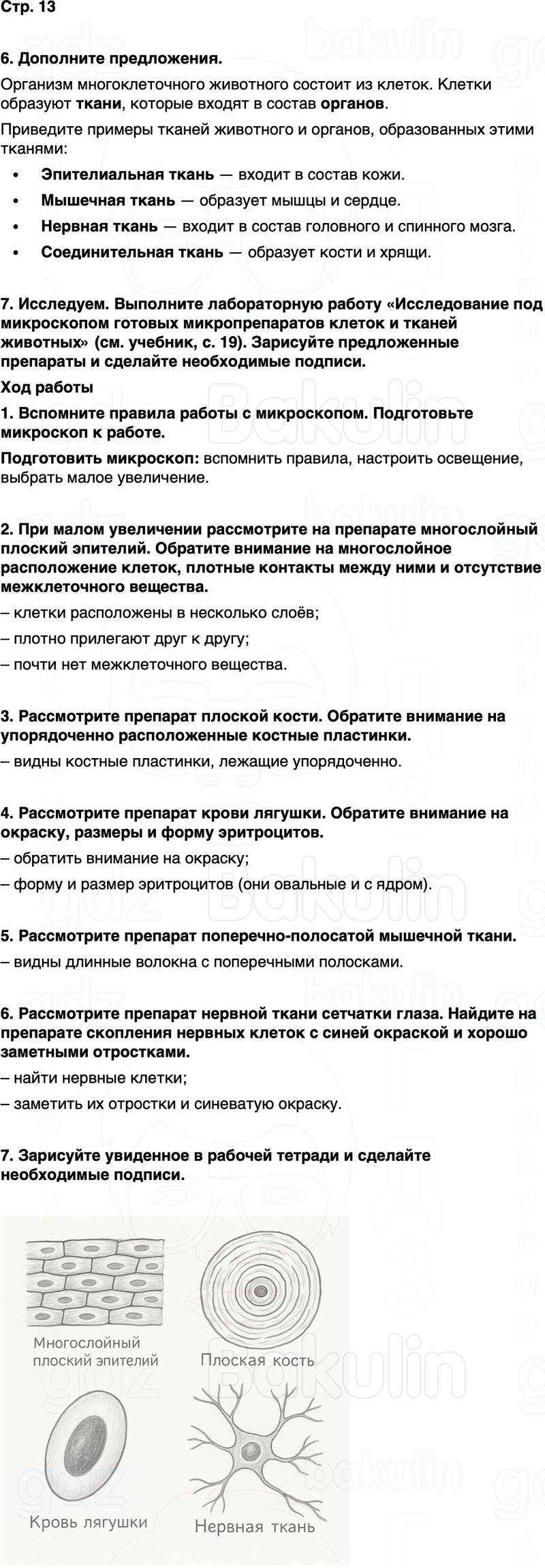 7. Исследуем. Выполните лабораторную работу «Исследование под микроскопом готовых микропрепаратов клеток и тканей животных» (см. учебник, с. 19). Зарисуйте предложенные препараты и сделайте необходимые подписи.