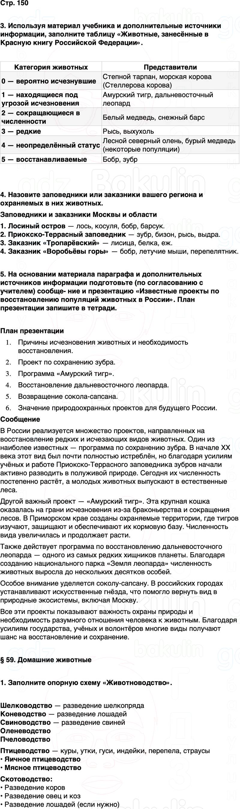 5. На основании материала параграфа и дополнительных источников информации подготовьте (по согласованию с учителем) сообщение и презентацию «Известные проекты по восстановлению популяций животных в России». План презентации запишите в тетради.