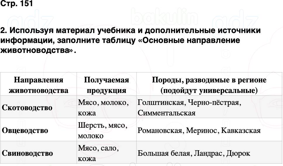 2. Используя материал учебника и дополнительные источники информации, заполните таблицу «Основные направление животноводства».