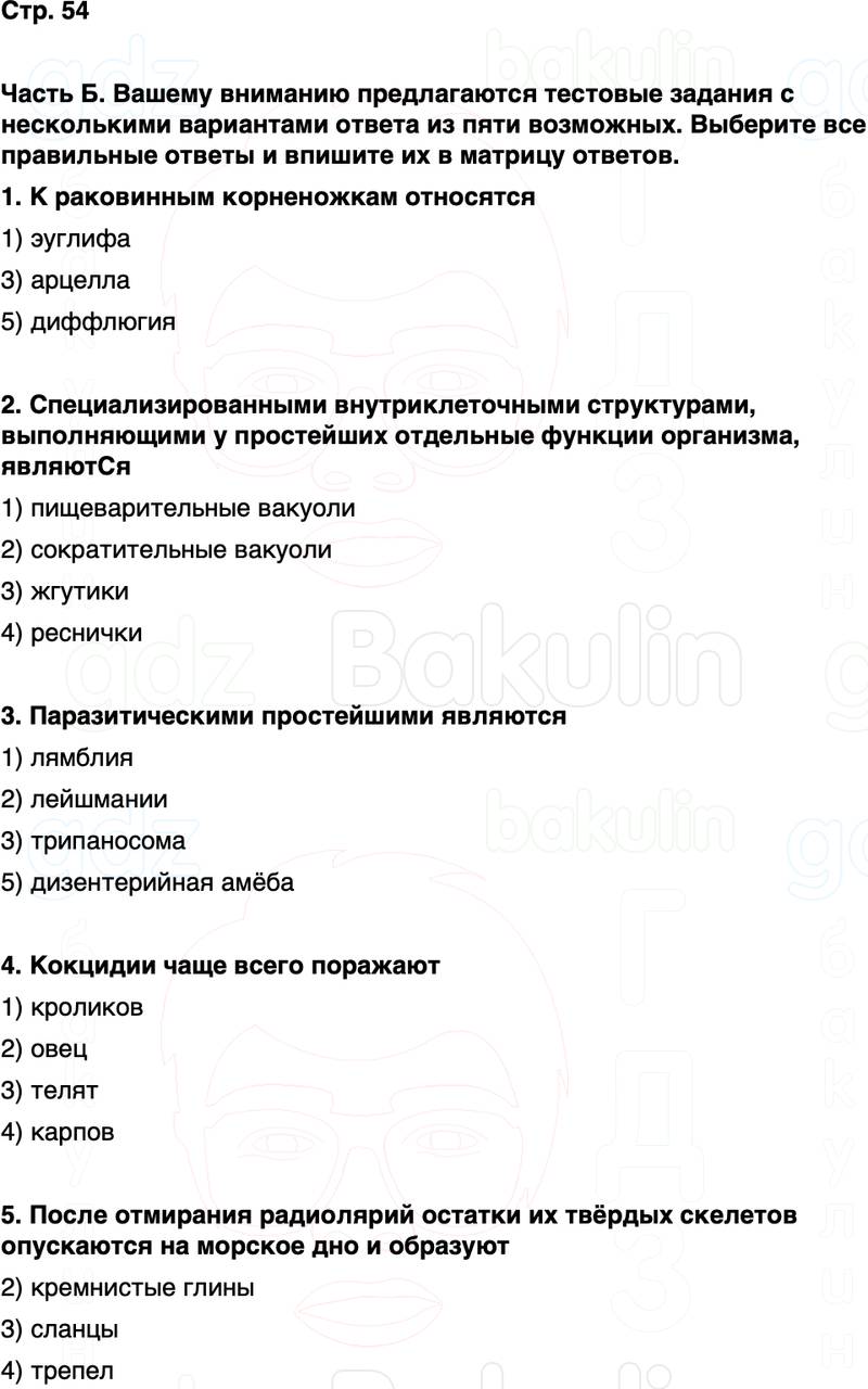 Часть Б. Вашему вниманию предлагаются тестовые задания с несколькими вариантами ответа из пяти возможных. Выберите все правильные ответы и впишите их в матрицу ответов.