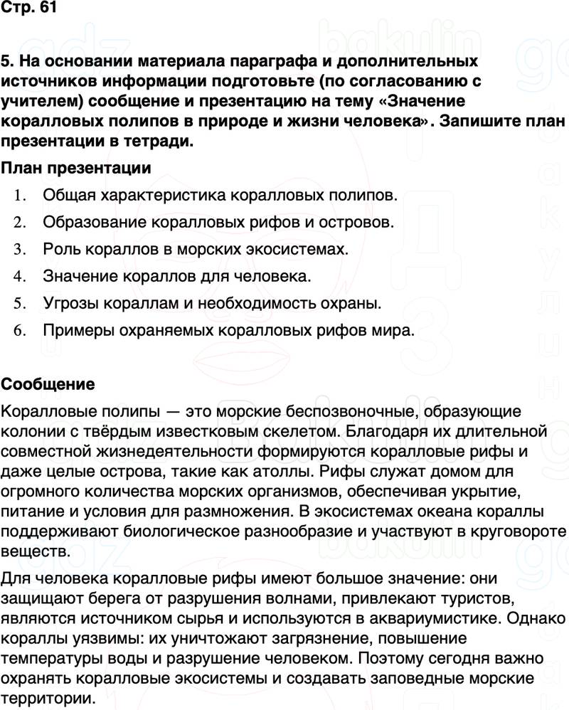 5. На основании материала параграфа и дополнительных источников информации подготовьте (по согласованию с учителем) сообщение и презентацию на тему «Значение коралловых полипов в природе и жизни человека». Запишите план презентации в тетради.