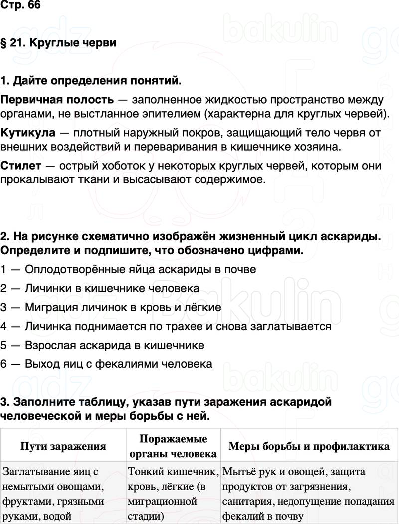 3. Заполните таблицу, указав пути заражения аскаридой человеческой и меры борьбы с ней.