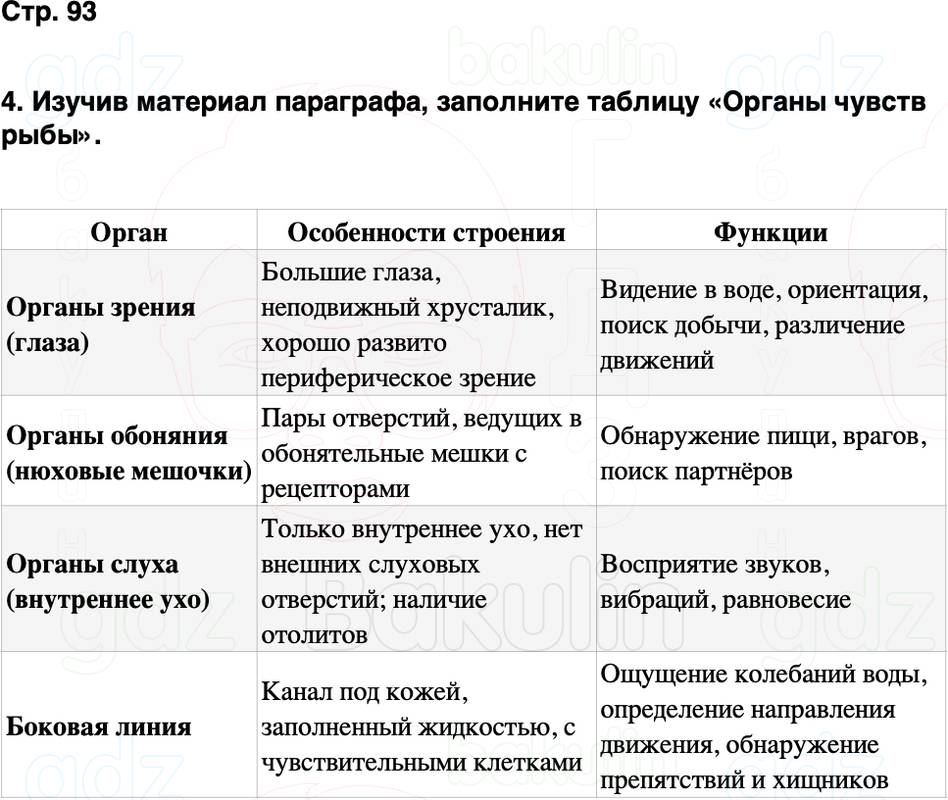 4. Изучив материал параграфа, заполните таблицу «Органы чувств рыбы».
