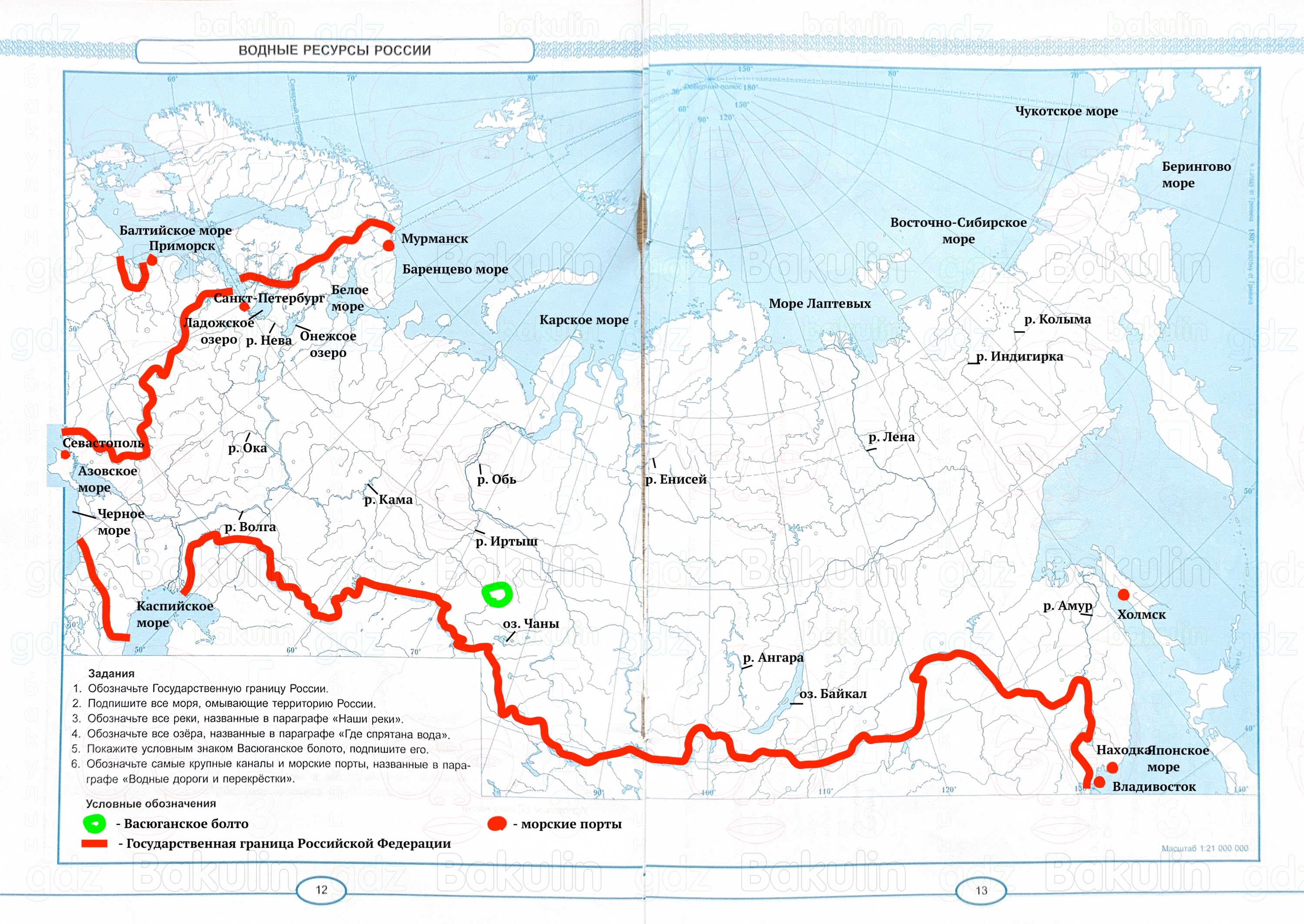 2. Подпишите все моря, омывающие территорию России.