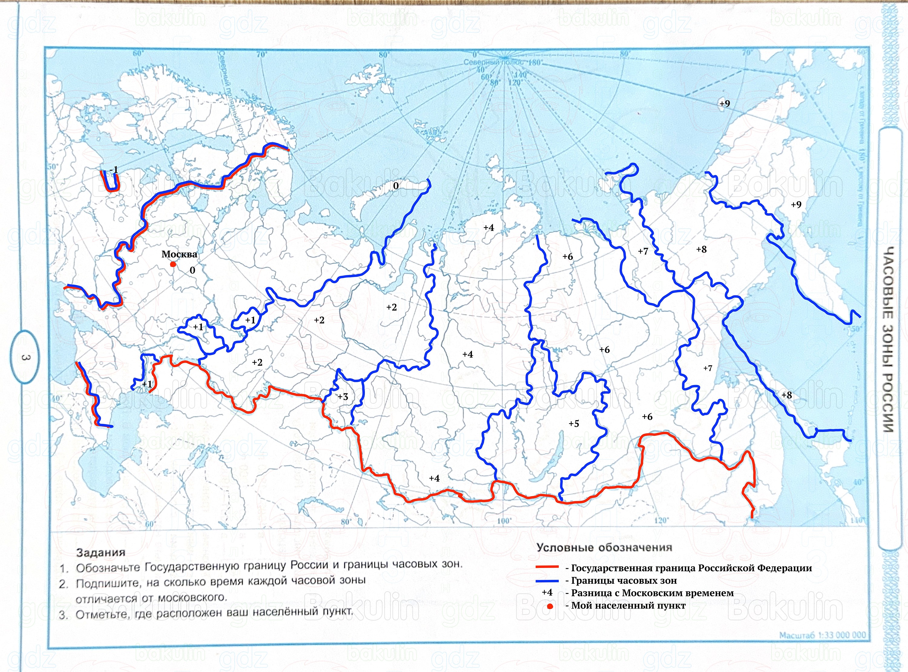 1. Обозначьте Государственную границу России и границы часовых зон.