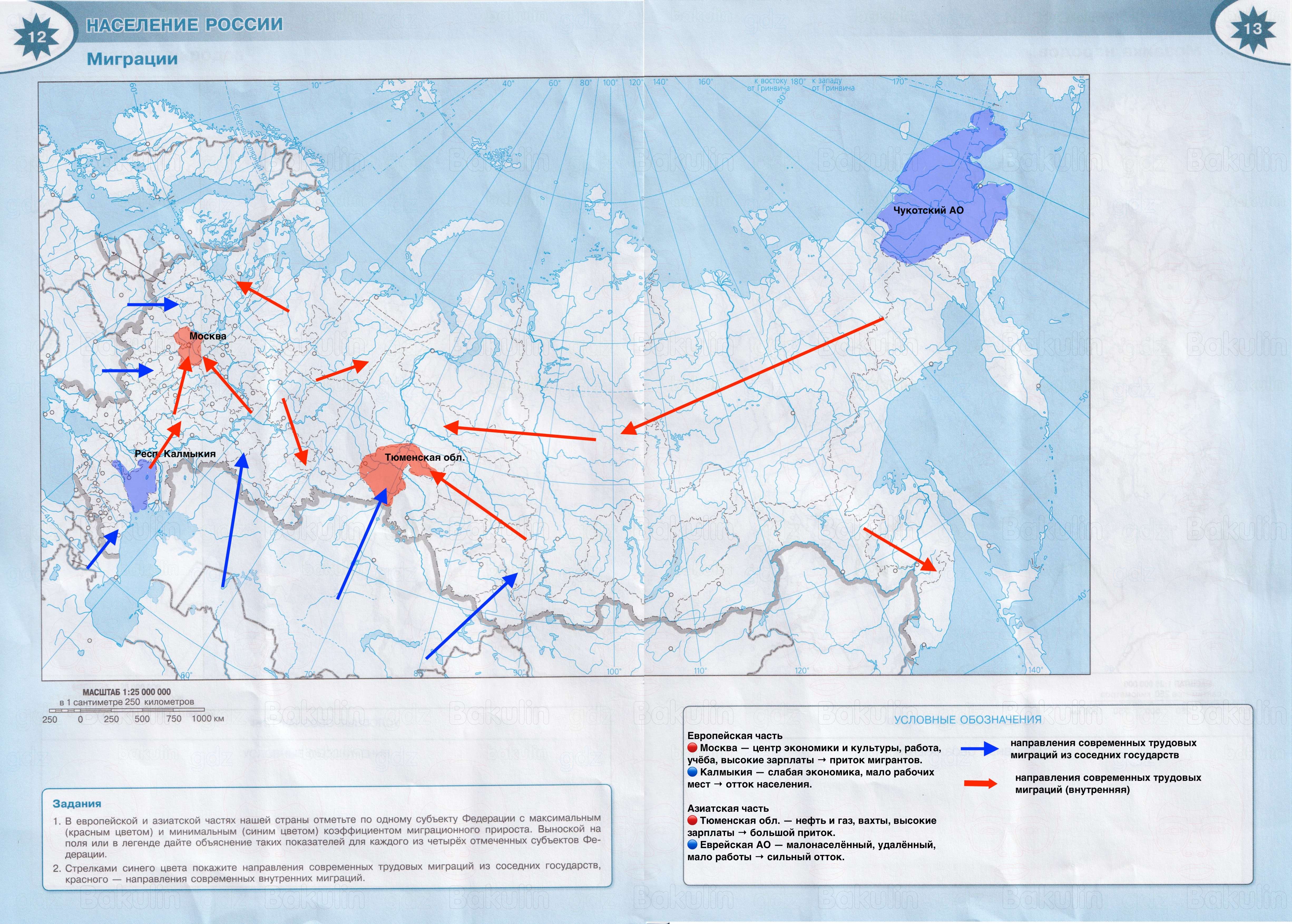 1. В европейской и азиатской частях нашей страны отметьте по одному субъекту Федерации с максимальным (красным цветом) и минимальным (синим цветом) коэффициентом миграционного прироста. Выноской на поля или в легенде дайте объяснение таких показателей для каждого из четырёх отмеченных субъектов Федерации.