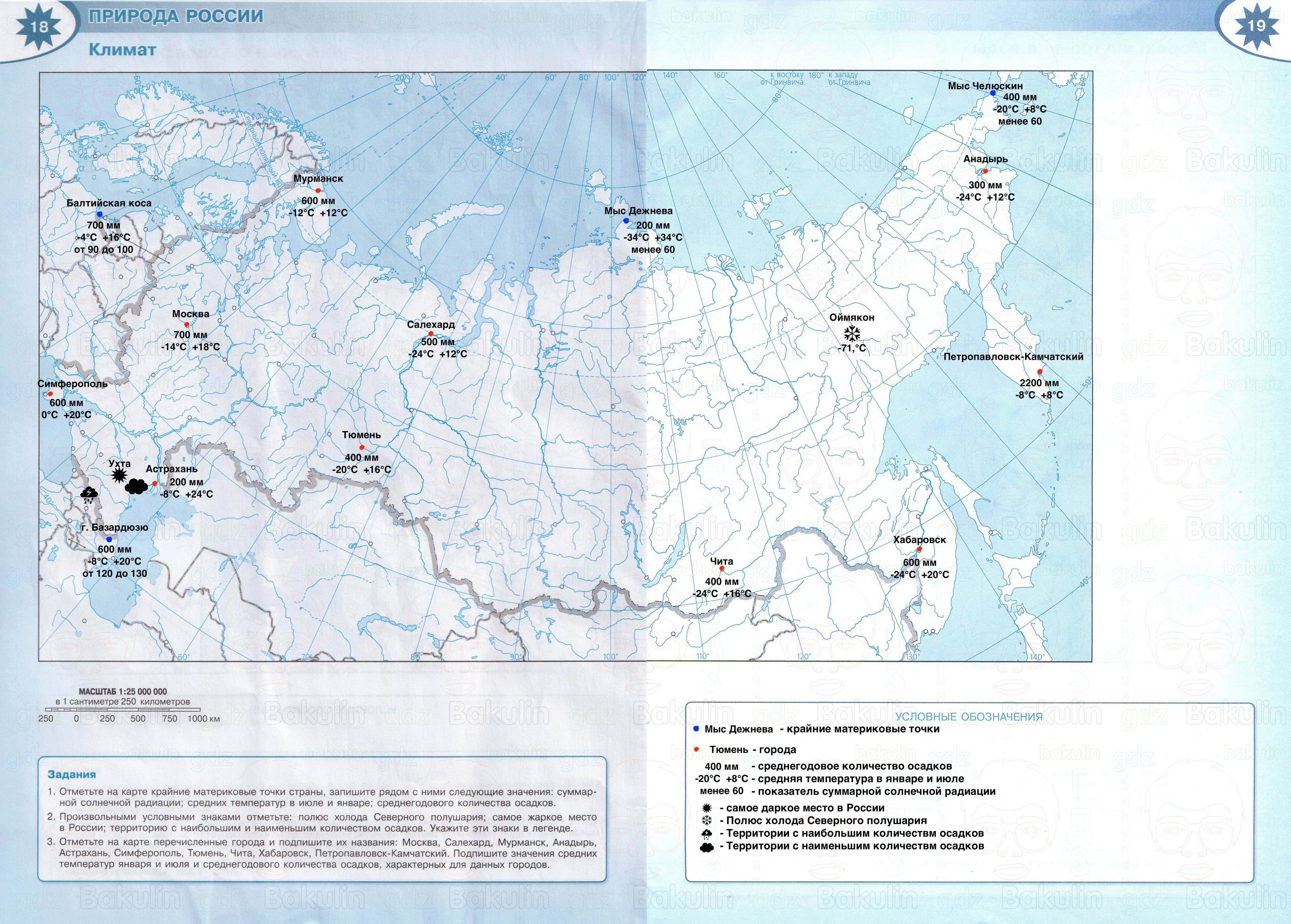 1. Отметьте на карте крайние материковые точки страны, запишите рядом с ними следующие значения: суммарной солнечной радиации; средних температур в июле и январе; среднегодового количества осадков.