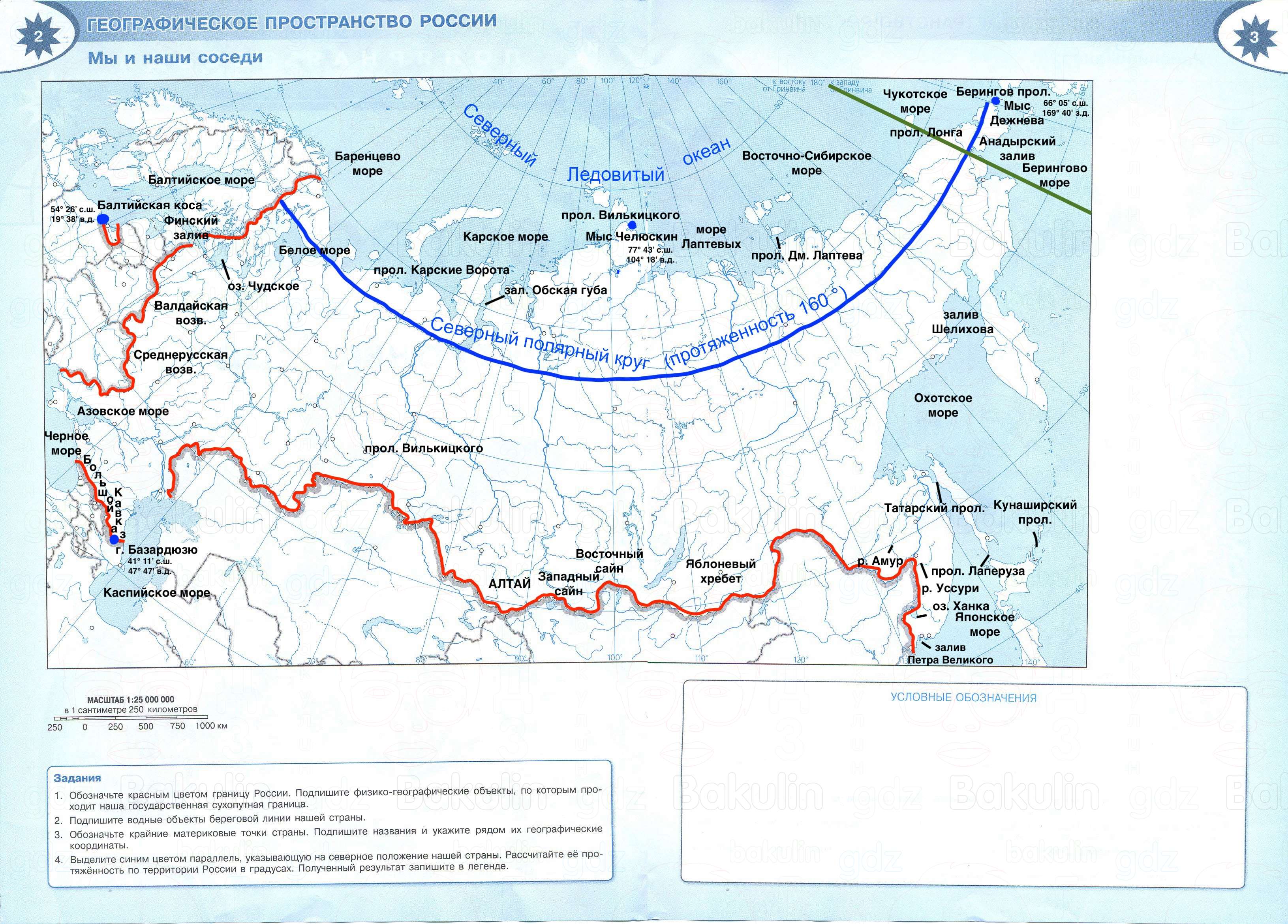 3. Обозначьте крайние материковые точки страны. Подпишите названия и укажите рядом их географические координаты.