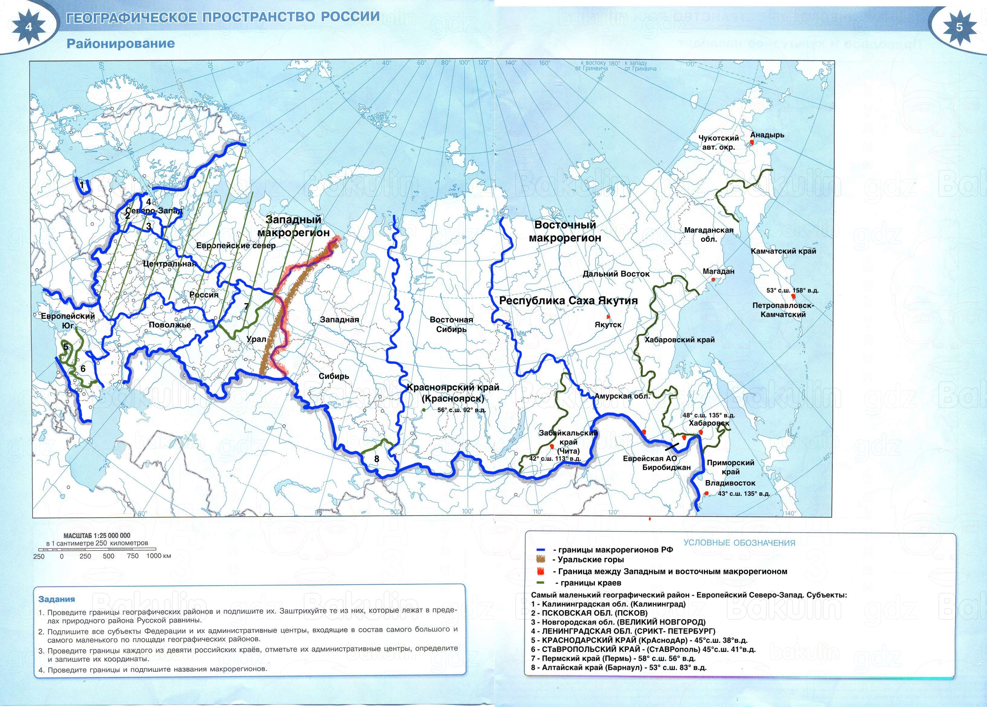 3. Проведите границы каждого из девяти российских краёв, отметьте их административные центры, определите и запишите их координаты.