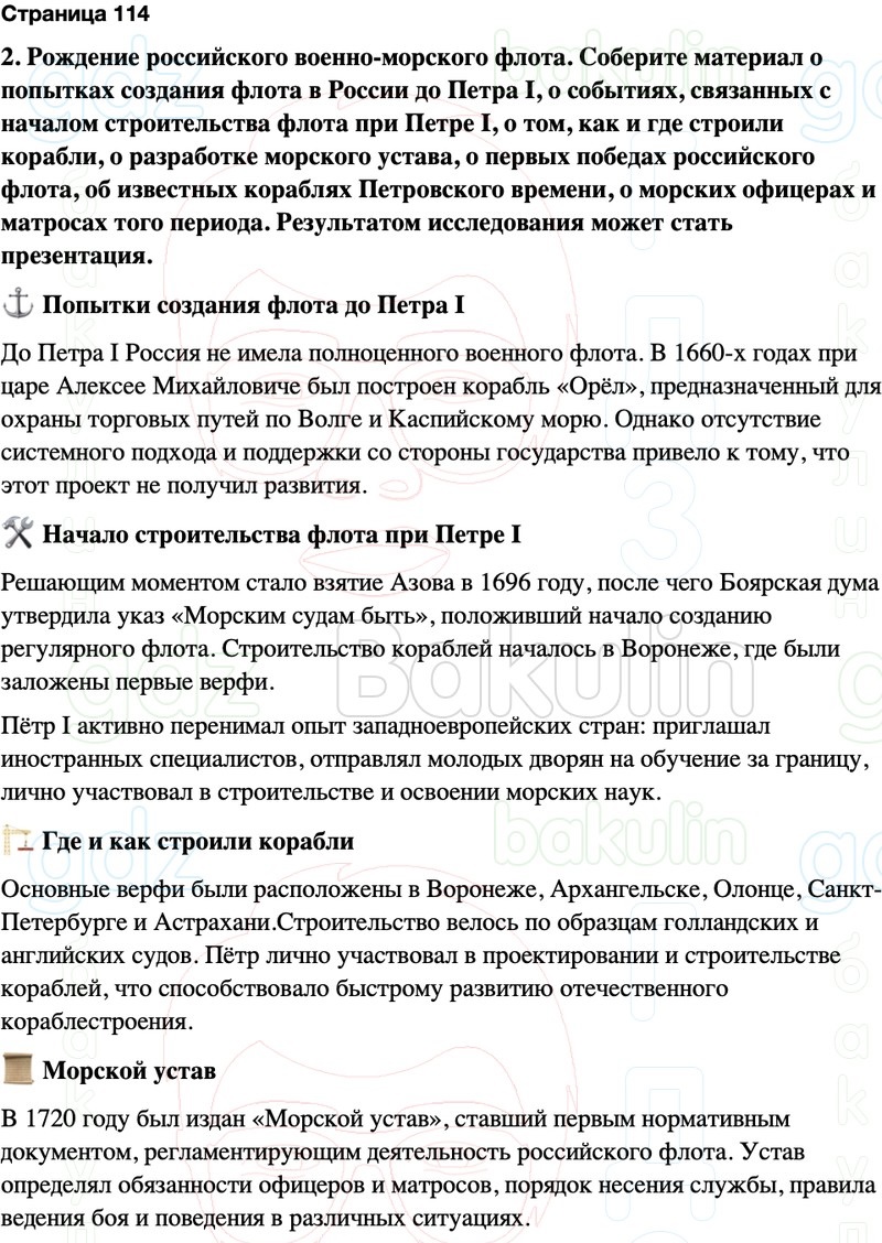 2. Рождение российского военно-морского флота. Соберите материал о попытках создания флота в России до Петра I, о событиях, связанных с началом строительства флота при Петре I, о том, как и где строили корабли, о разработке морского устава, о первых победах российского флота, об известных кораблях Петровского времени, о морских офицерах и матросах того периода. Результатом исследования может стать презентация.