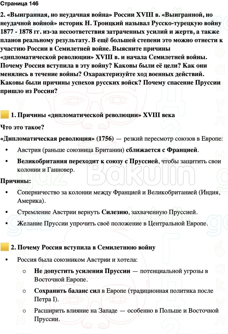 2. «Выигранная, но неудачная война» России XVIII в. «Выигранной, но неудачной войной» историк Н. Троицкий называл Русско-турецкую войну 1877 - 1878 гг. из-за несоответствия затраченных усилий и жертв, а также планов реальному результату. В ещё большей степени это можно отнести к участию России в Семилетней войне. Выясните причины «дипломатической революции» XVIII в. и начала Семилетней войны. Почему Россия вступила в эту войну? Каковы были её цели? Как они менялись в течение войны? Охарактеризуйте ход военных действий. Каковы были причины успехов русских войск? Почему спасение Пруссии пришло из России?