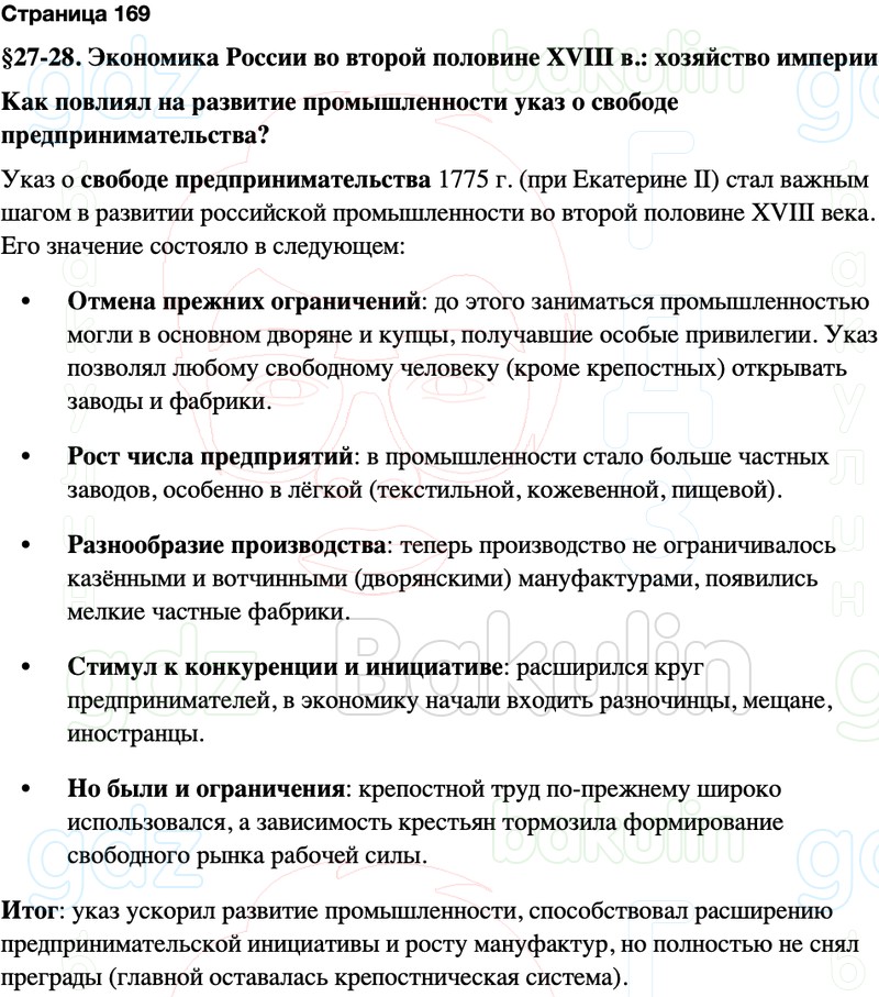 Правильный ответ к заданию из ГДЗ История России 8 класс Мединский, Торкунов Страница, номер 169 бесплатно онлайн