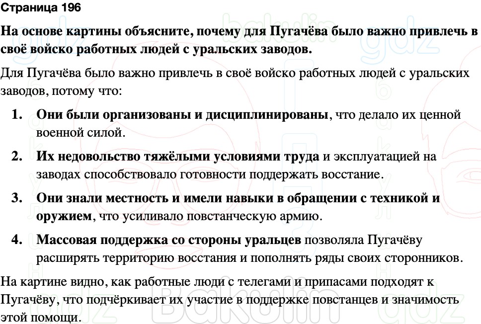На основе картины объясните, почему для Пугачёва было важно привлечь в своё войско работных людей с уральских заводов.