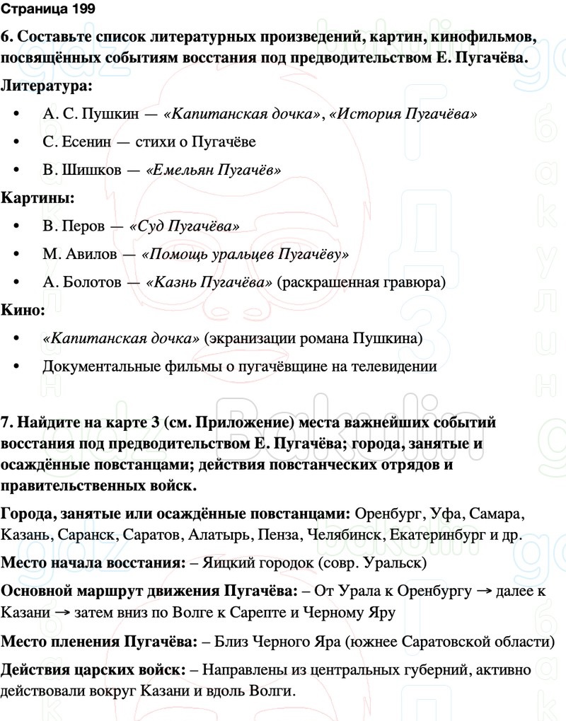 6. Составьте список литературных произведений, картин, кинофильмов, посвящённых событиям восстания под предводительством Е. Пугачёва.