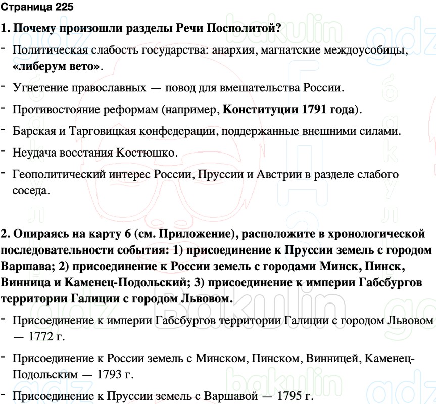 2. Опираясь на карту 6 (см. Приложение), расположите в хронологической последовательности события: 1) присоединение к Пруссии земель с городом Варшава; 2) присоединение к России земель с городами Минск, Пинск, Винница и Каменец-Подольский; 3) присоединение к империи Габсбургов территории Галиции с городом Львовом.