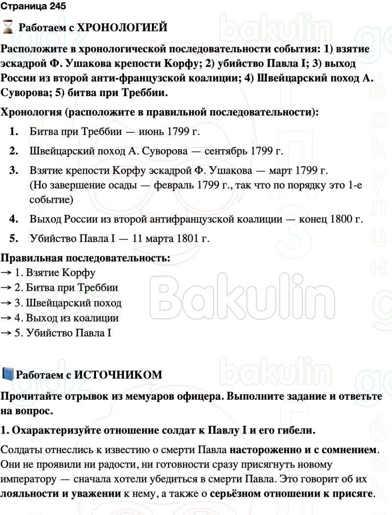 Расположите в хронологической последовательности события: 1) взятие эскадрой Ф. Ушакова крепости Корфу; 2) убийство Павла I; 3) выход России из второй анти-французской коалиции; 4) Швейцарский поход А. Суворова; 5) битва при Треббии.