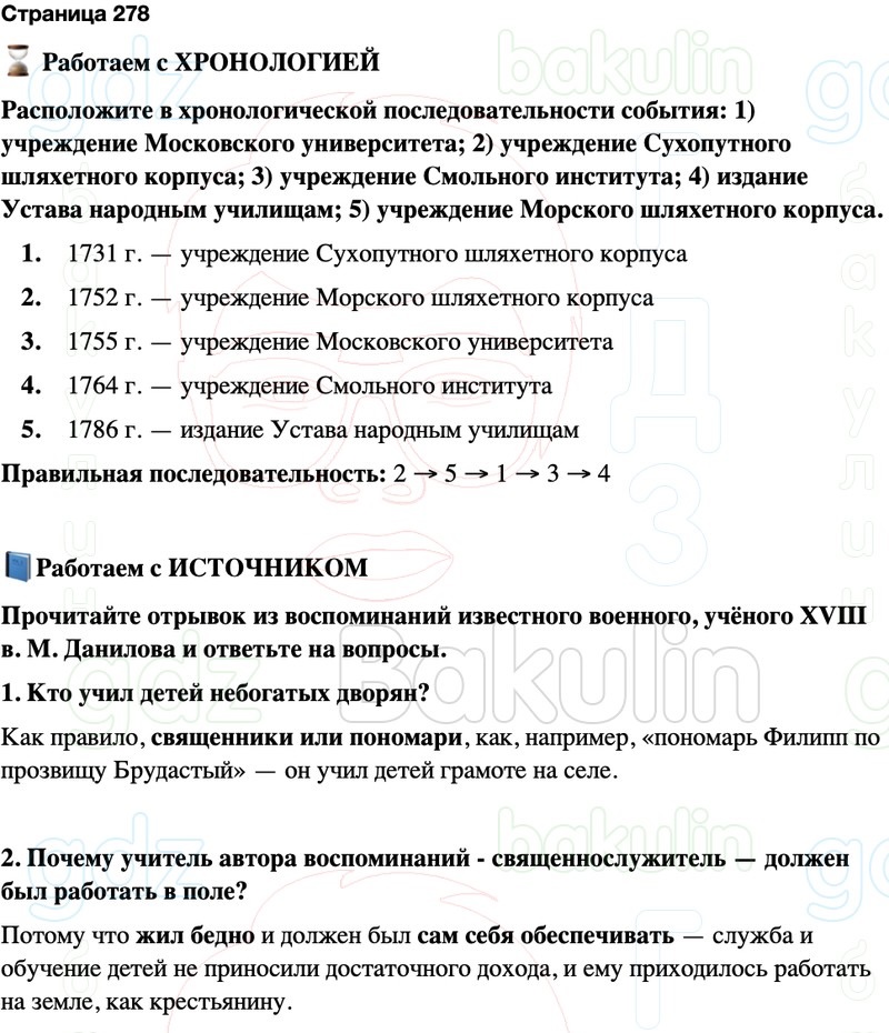 Расположите в хронологической последовательности события: 1) учреждение Московского университета; 2) учреждение Сухопутного шляхетного корпуса; 3) учреждение Смольного института; 4) издание Устава народным училищам; 5) учреждение Морского шляхетного корпуса.
