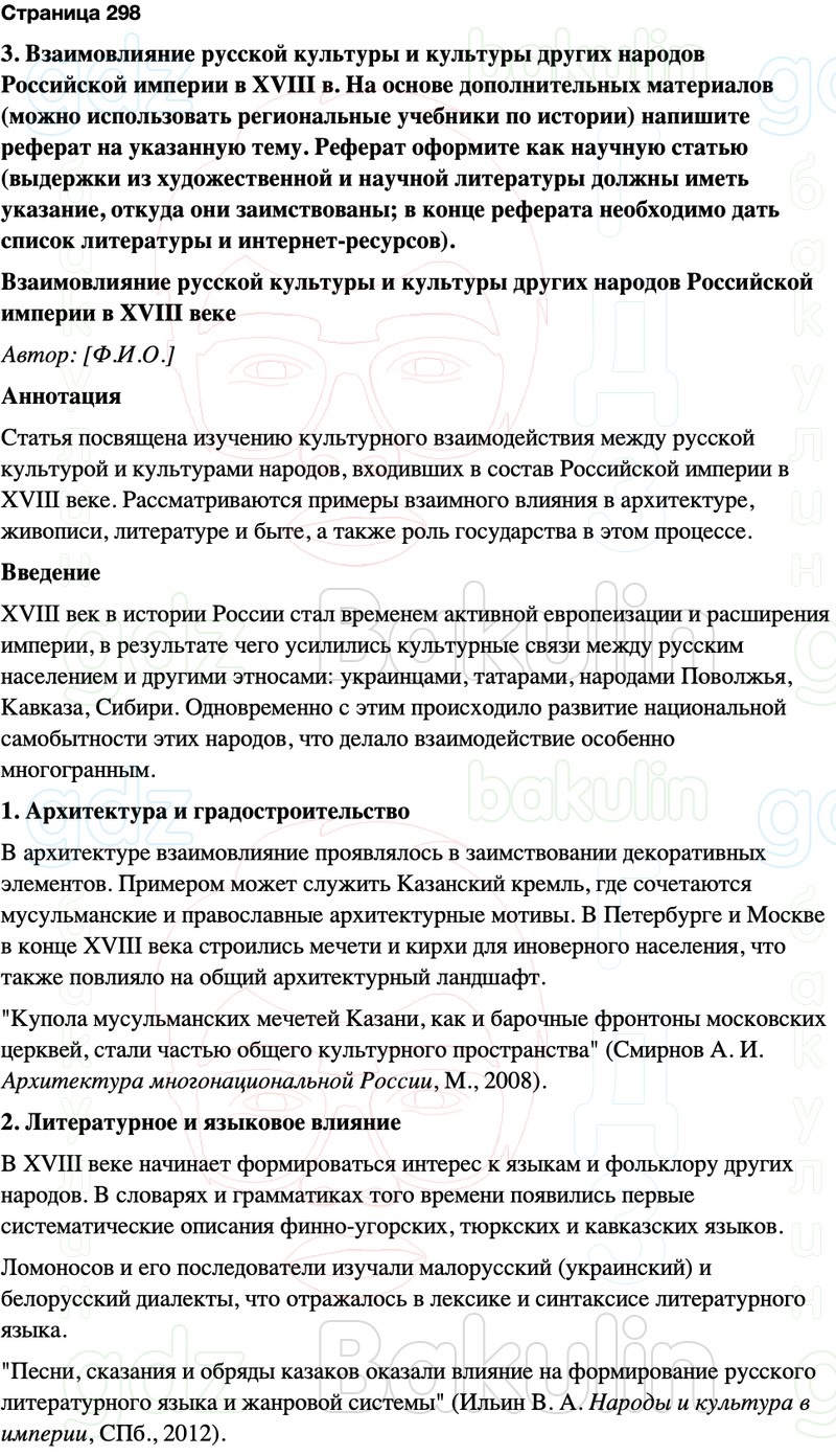 3. Взаимовлияние русской культуры и культуры других народов Российской империи в XVIII в. На основе дополнительных материалов (можно использовать региональные учебники по истории) напишите реферат на указанную тему. Реферат оформите как научную статью (выдержки из художественной и научной литературы должны иметь указание, откуда они заимствованы; в конце реферата необходимо дать список литературы и интернет-ресурсов).