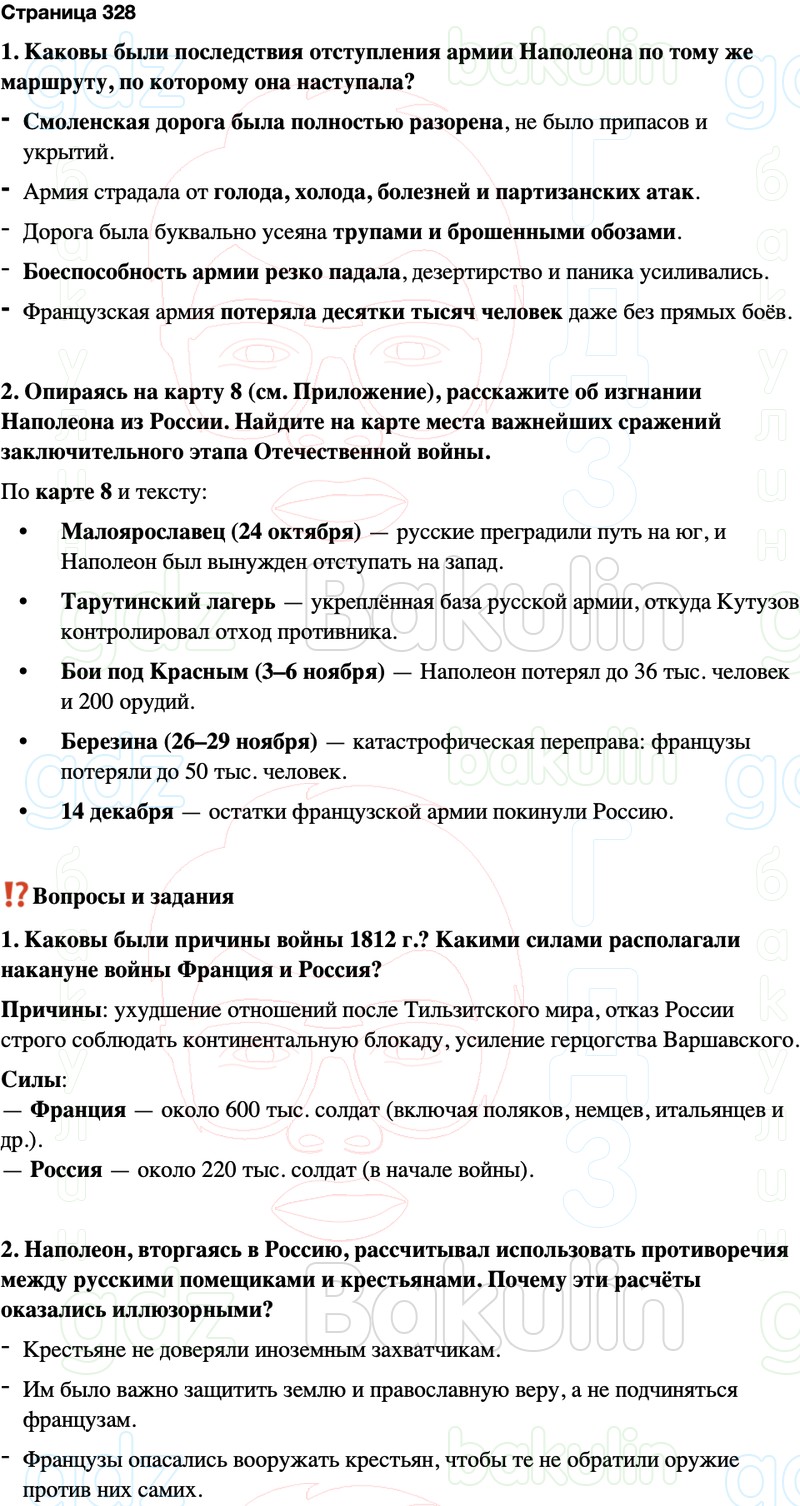 1. Каковы были последствия отступления армии Наполеона по тому же маршруту, по которому она наступала?
