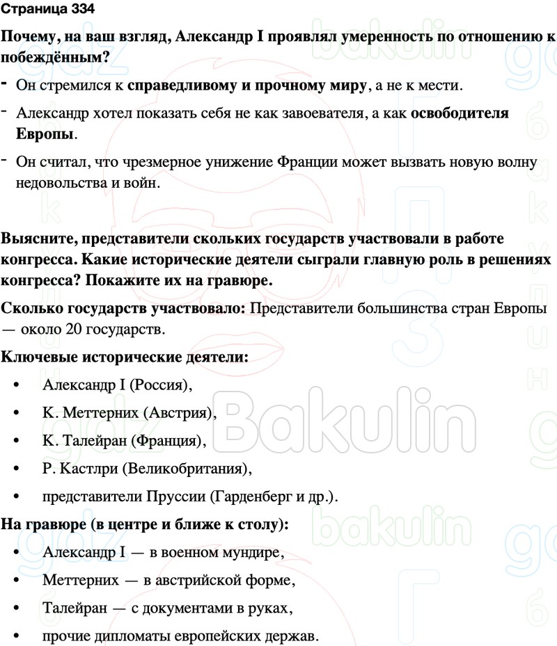 Выясните, представители скольких государств участвовали в работе конгресса. Какие исторические деятели сыграли главную роль в решениях конгресса? Покажите их на гравюре.
