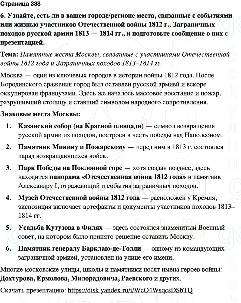 6. Узнайте, есть ли в вашем городе/регионе места, связанные с событиями или жизнью участников Отечественной войны 1812 г., Заграничных походов русской армии 1813 — 1814 гг., и подготовьте сообщение о них с презентацией.