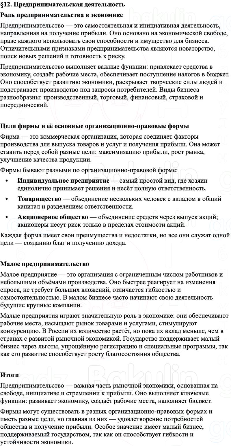 Краткое содержание пересказ Параграф 12. Предпринимательская деятельность