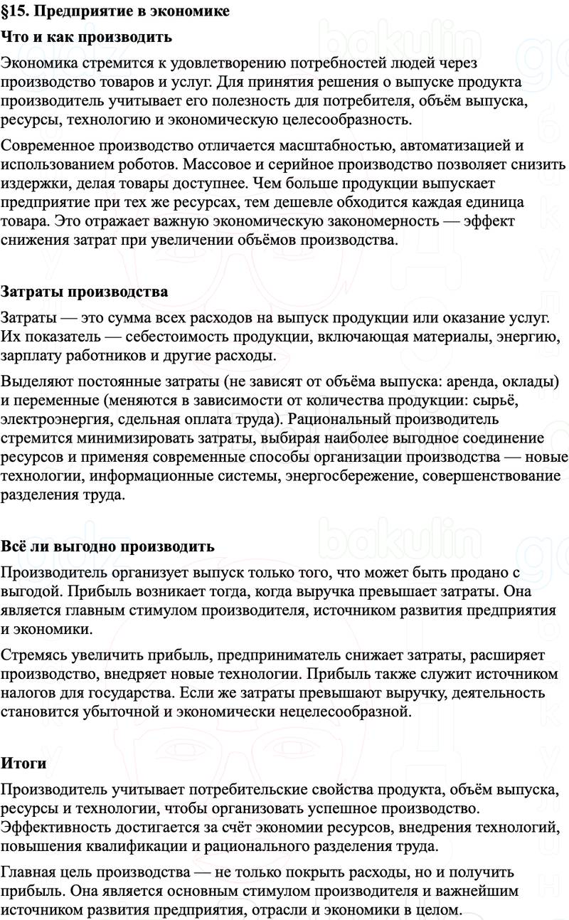 Краткое содержание пересказ Параграф 15. Предприятие в экономике