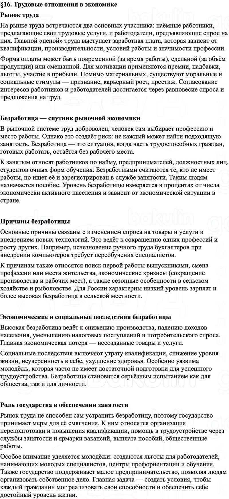 Краткое содержание пересказ Параграф 16. Трудовые отношения в экономике