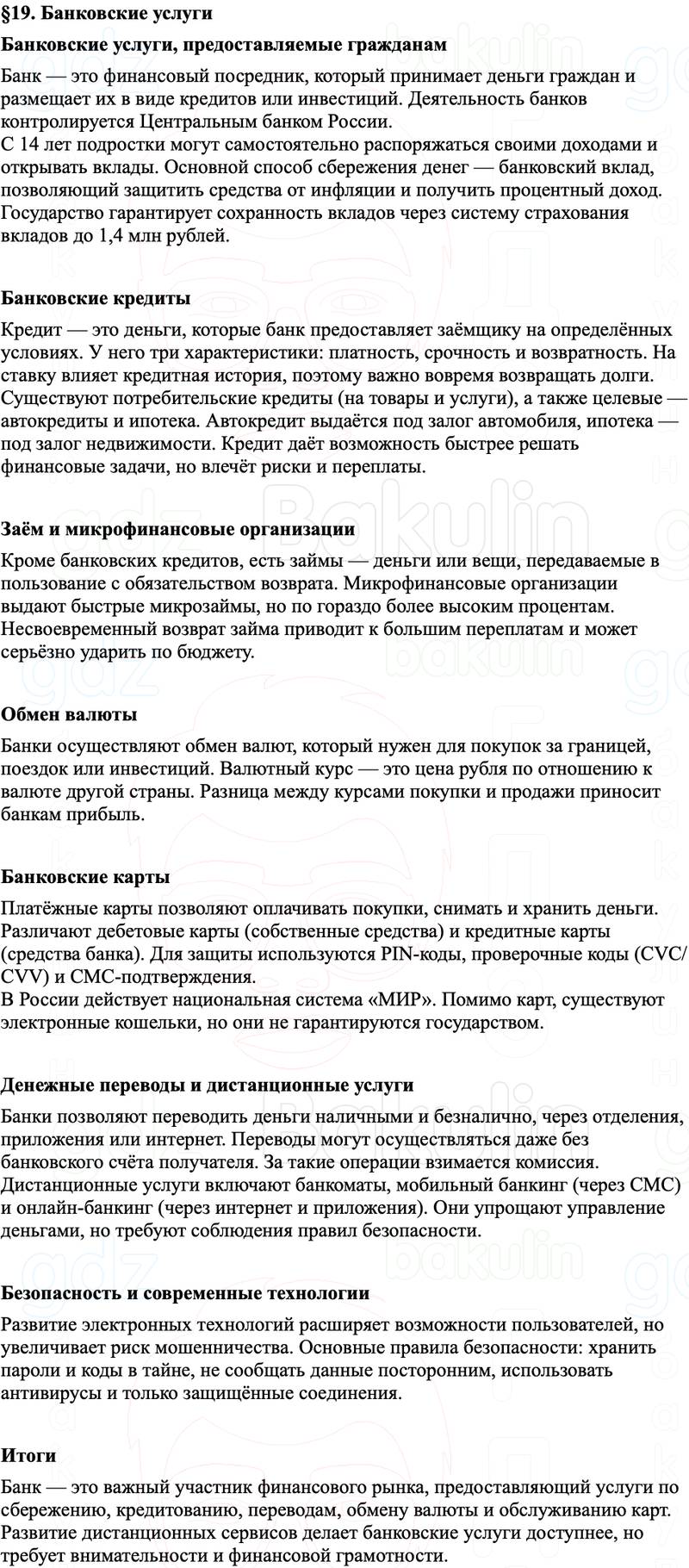 Краткое содержание пересказ Параграф 19. Банковские услуги