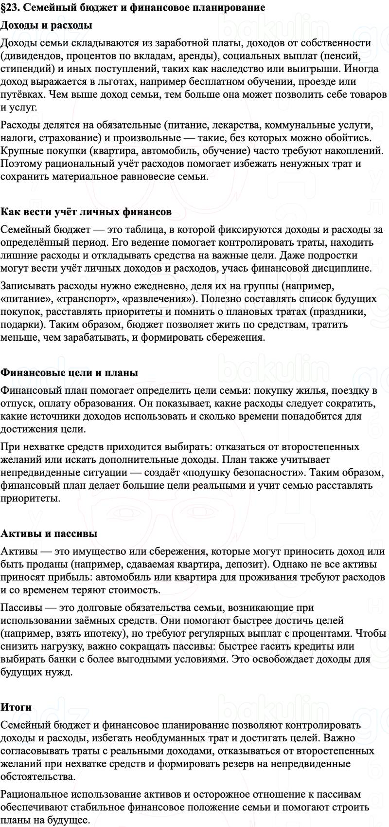 Краткое содержание пересказ Параграф 23. Семейный бюджет и финансовое планирование