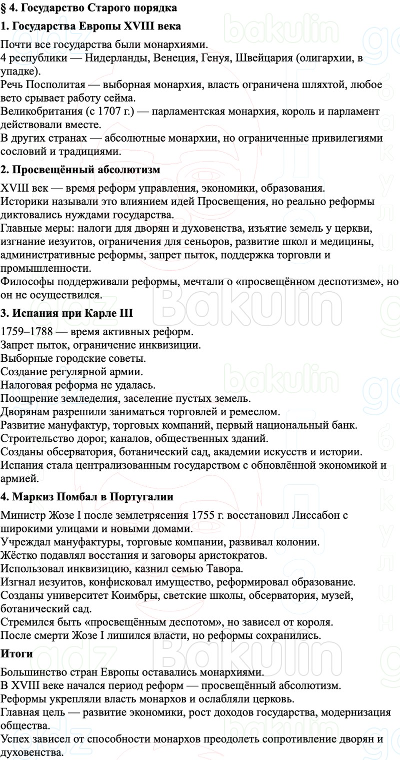 Правильный ответ к заданию Краткий пересказ содержание Всеобщая История нового времени XVIII-начало XIX в 8 класс Мединский, Чубарьян 2025